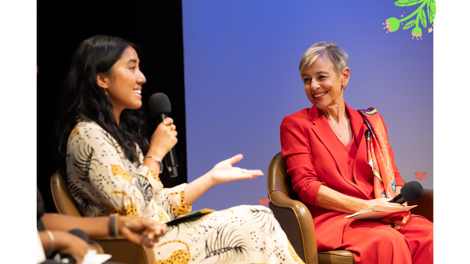 Following her stunning and heartfelt musical performance, which emphasized climate awareness and highlighted the beauty of our planet while calling for its urgent protection, Mary Robinson discussed with Mitzi Jonelle Tan and Dominique Palmer, climate activists and members of our Steering Committee, the importance of intergenerational dialogue in activism. She began by highlighting the urgency for faster progress in the climate movement, stating